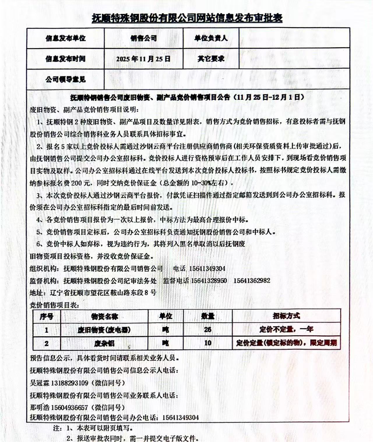 撫順特鋼銷售公司廢舊物資、副產(chǎn)品競(jìng)價(jià)銷售項(xiàng)目公告(11月25日-12月1日)