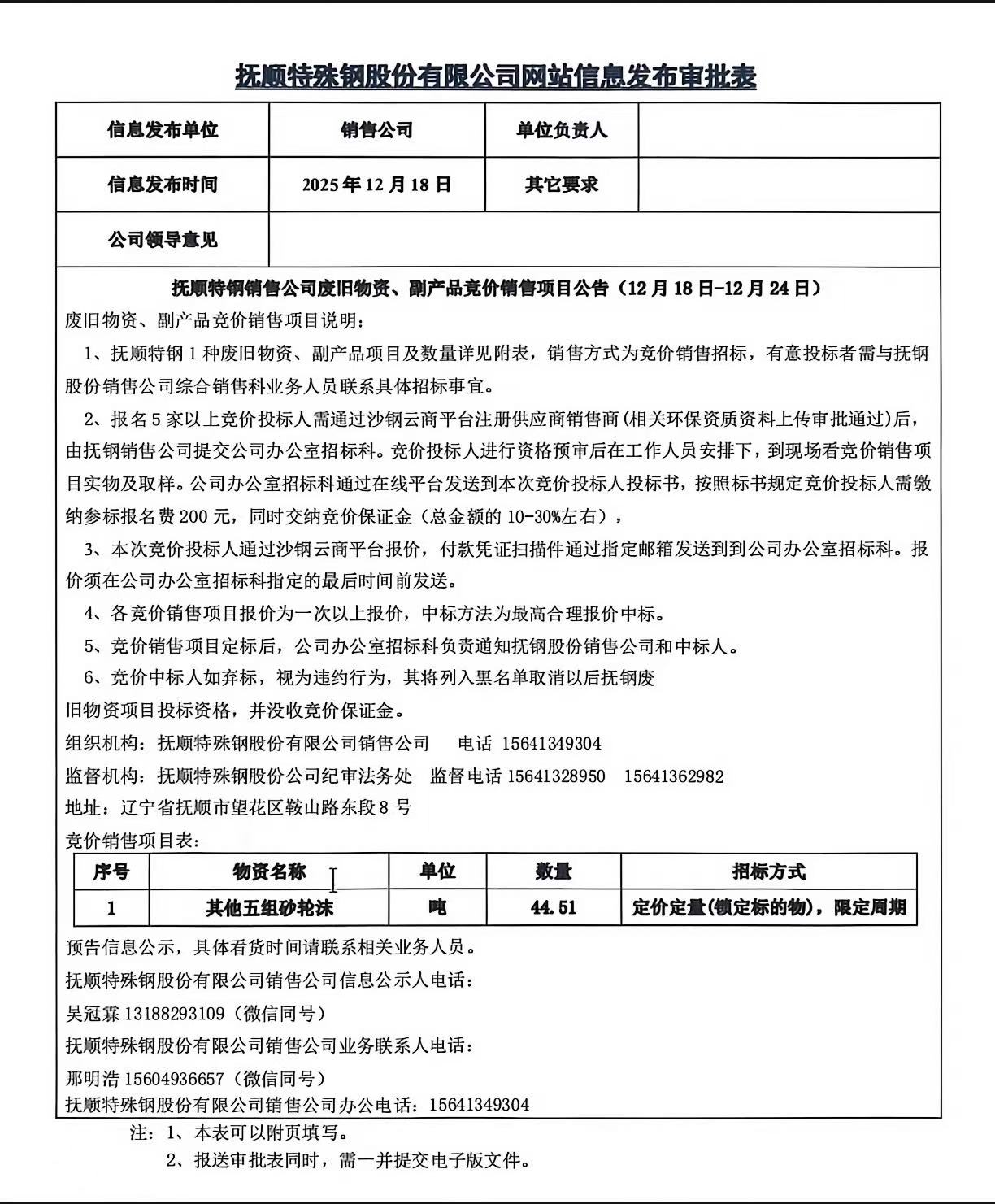 撫順特鋼銷售公司廢舊物資、副產(chǎn)品競價銷售項目公告(12月18日-12月24日)