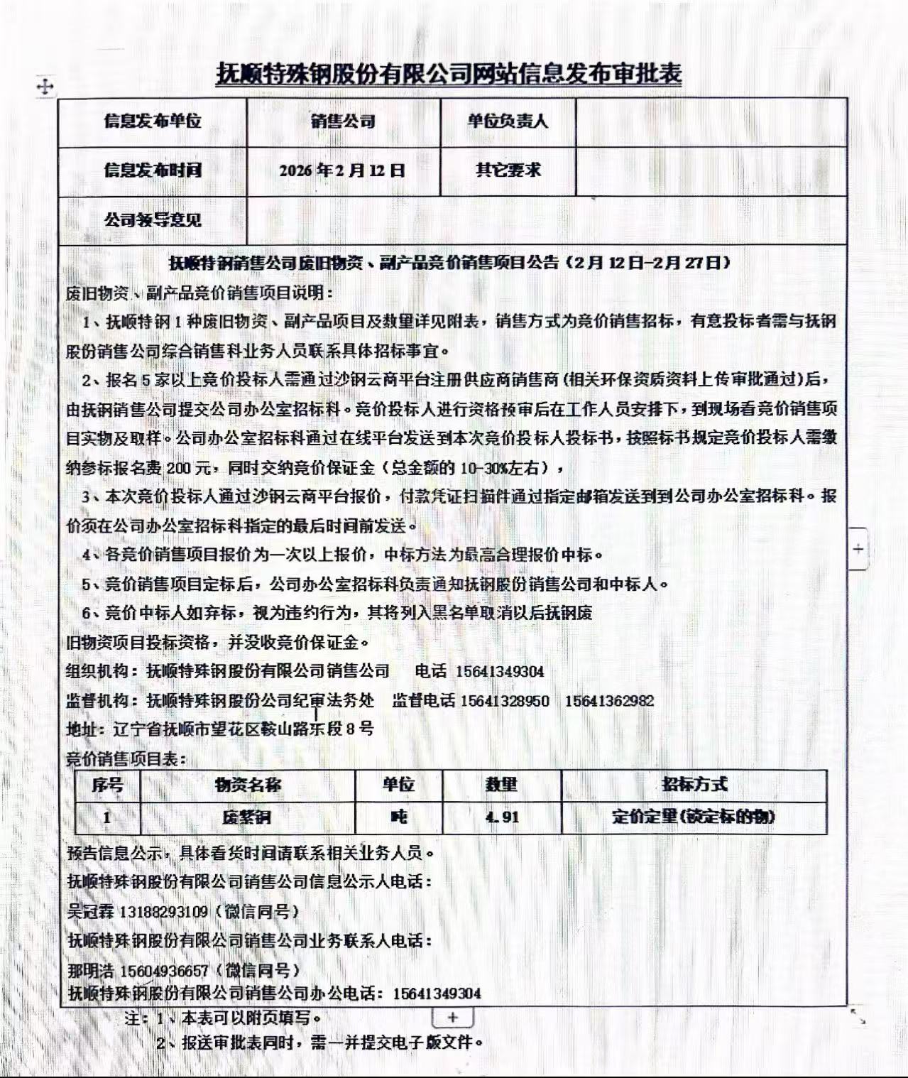 撫順特鋼銷售公司廢舊物資、副產(chǎn)品競價銷售項目公告(2月12日-2月27日)