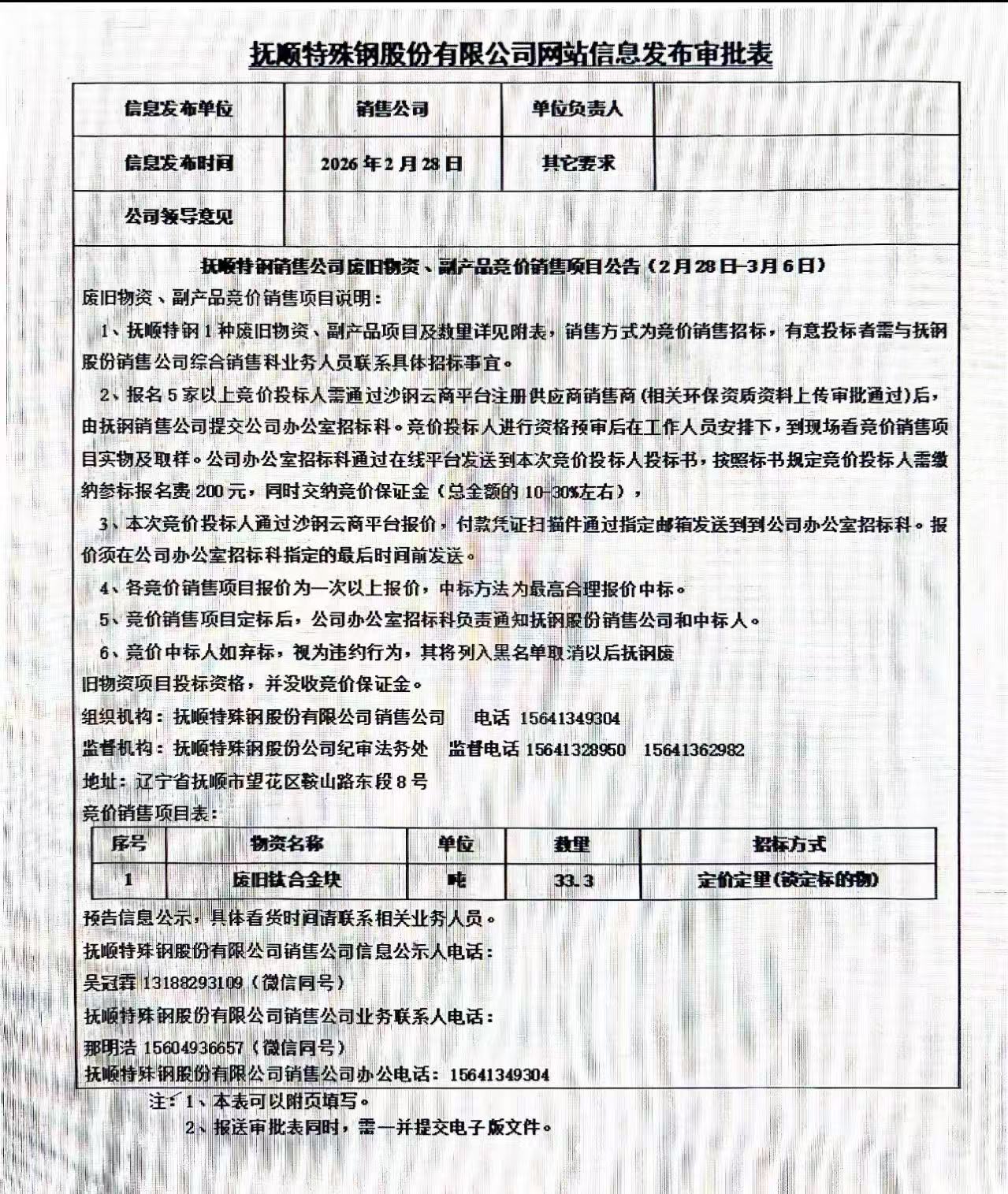 撫順特鋼銷售公司廢舊物資、副產(chǎn)品競價銷售項目公告(2月28日-3月6日)